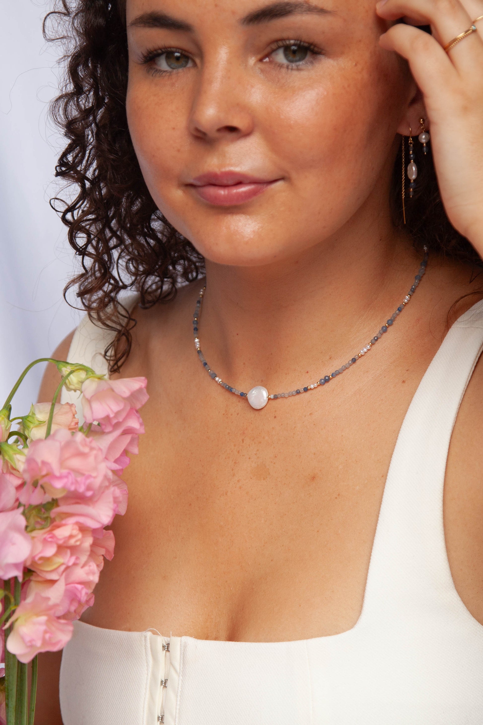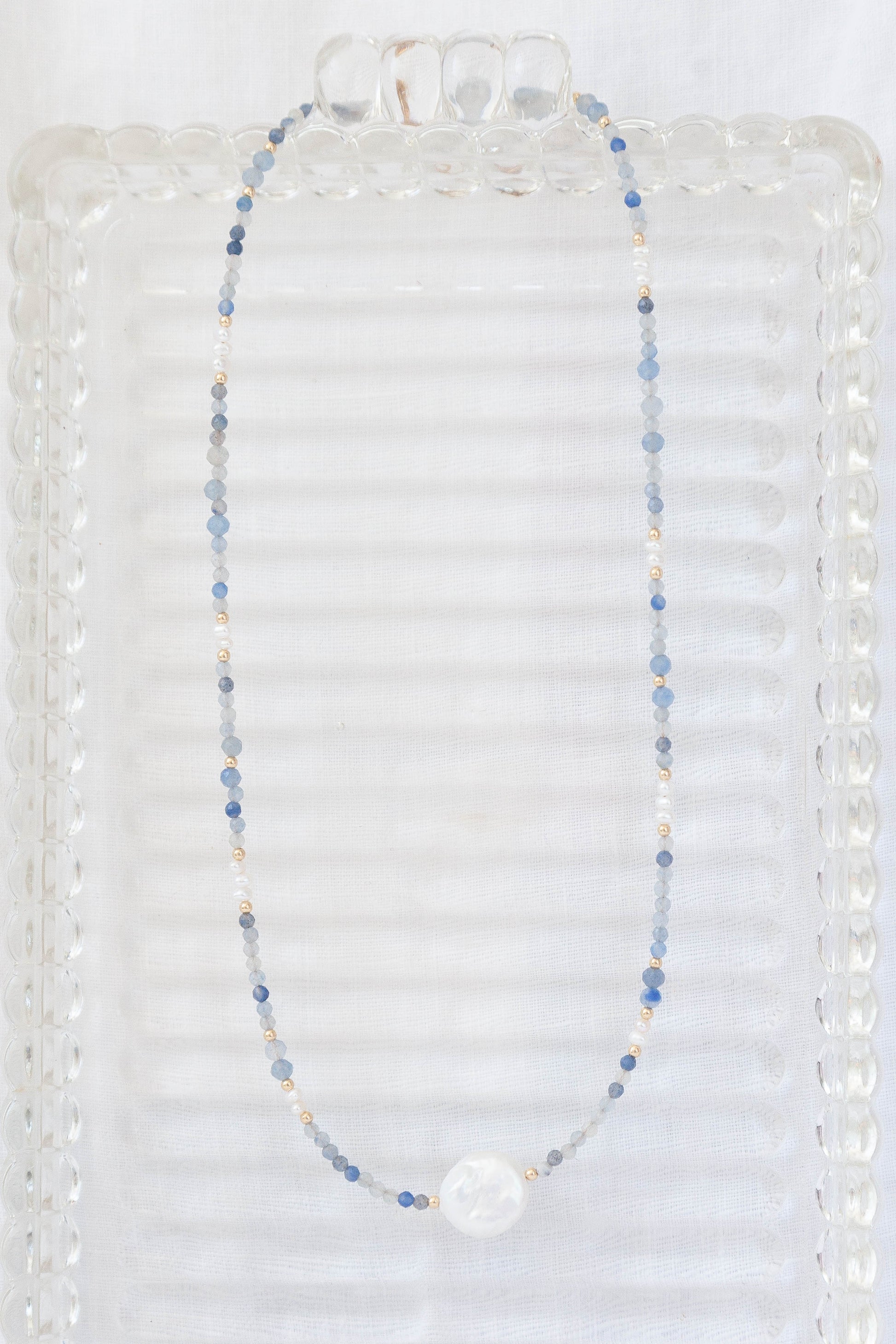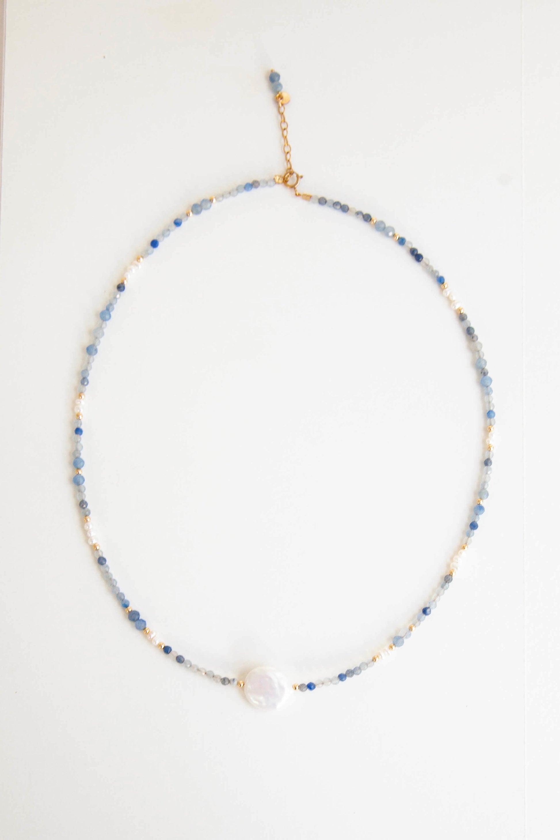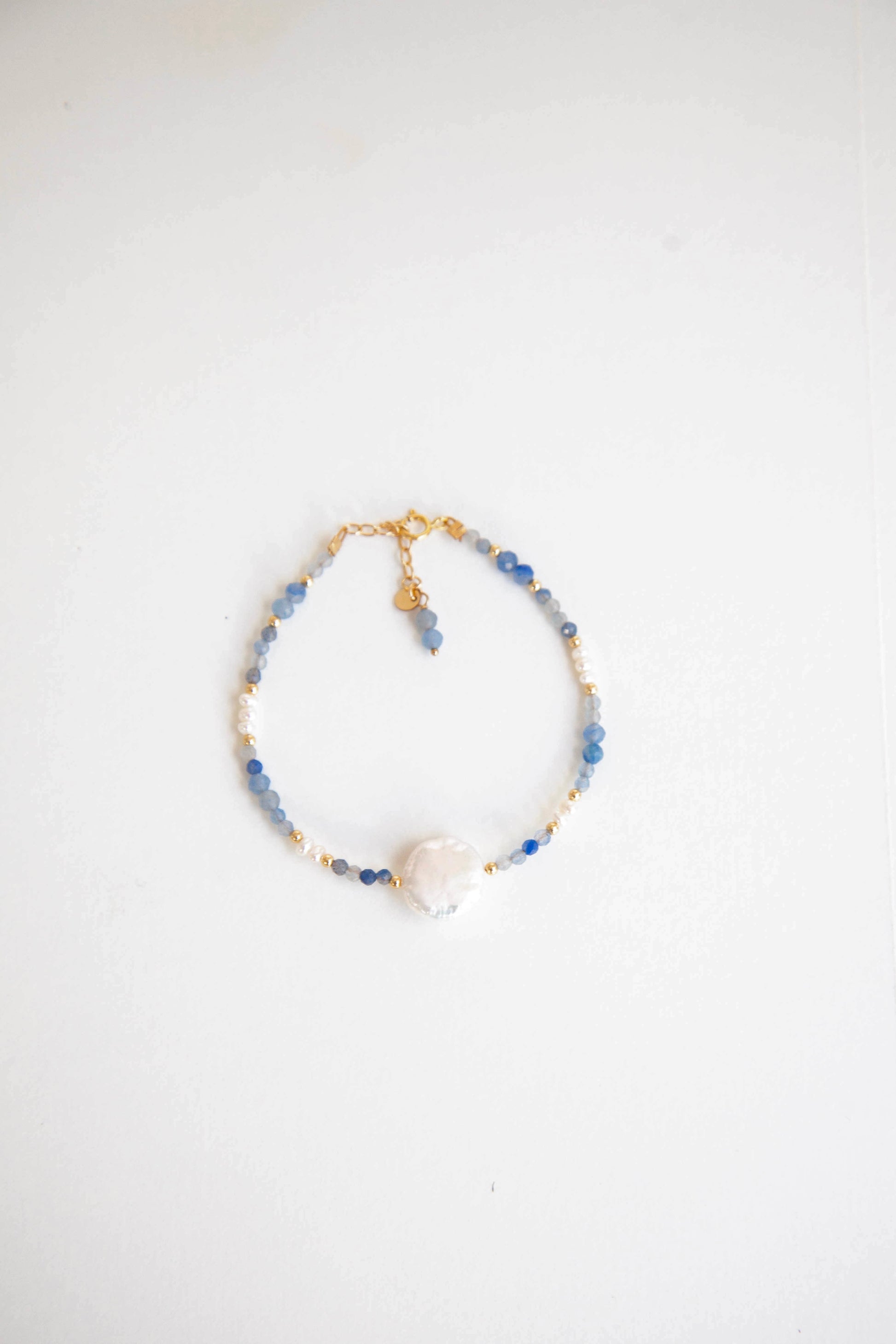 This elegant 14k gold filled matching necklace and bracelet set features faceted blue gemstones and a lustrous freshwater coin pearl as the centre piece. Available for purchase individually or as a matching set (saving $10).