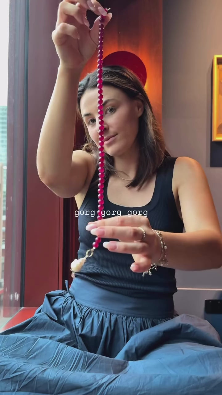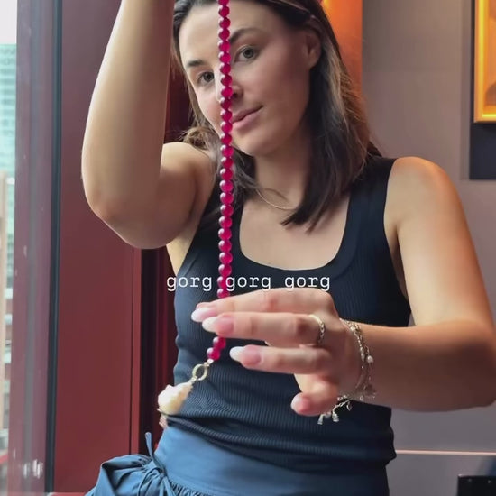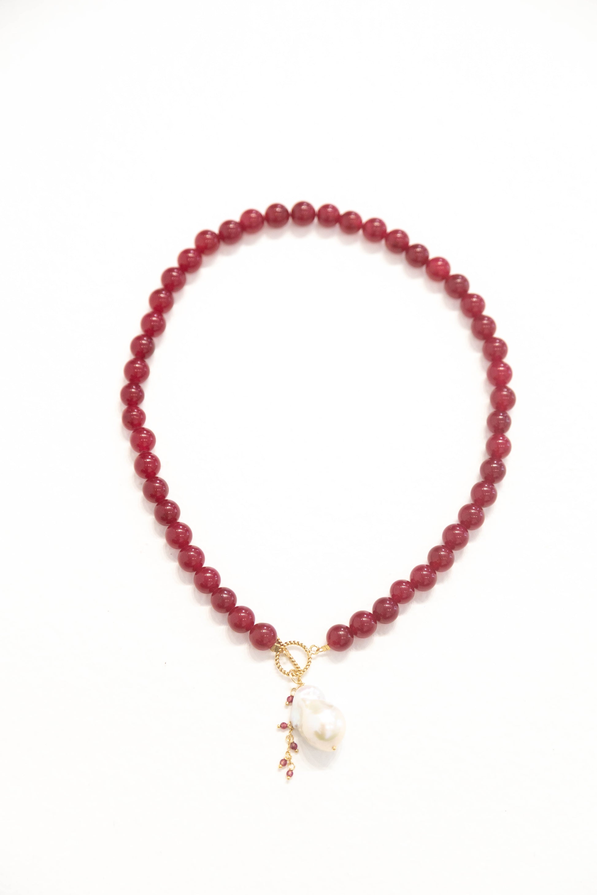 A handmade chunky beaded necklace featuring a deep red wine garnet stone and a natural baroque pearl. Finished with a subtle chain detail.